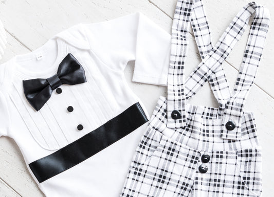 Baby Boy Leggings with Suspenders - Black & White Plaid