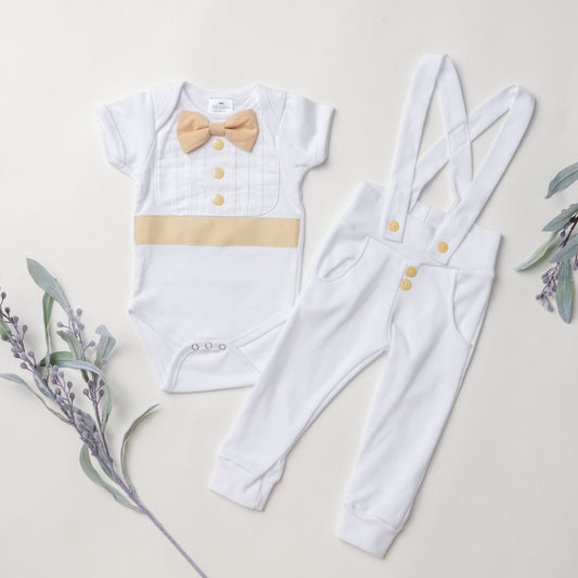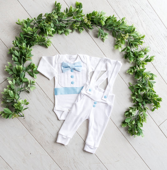 Our signature tuxedo-style baby outfits include two pieces: a tuxedo-style onesie with intricate details paired with soft, cotton suspender leggings. These outfits look great for any occasion!