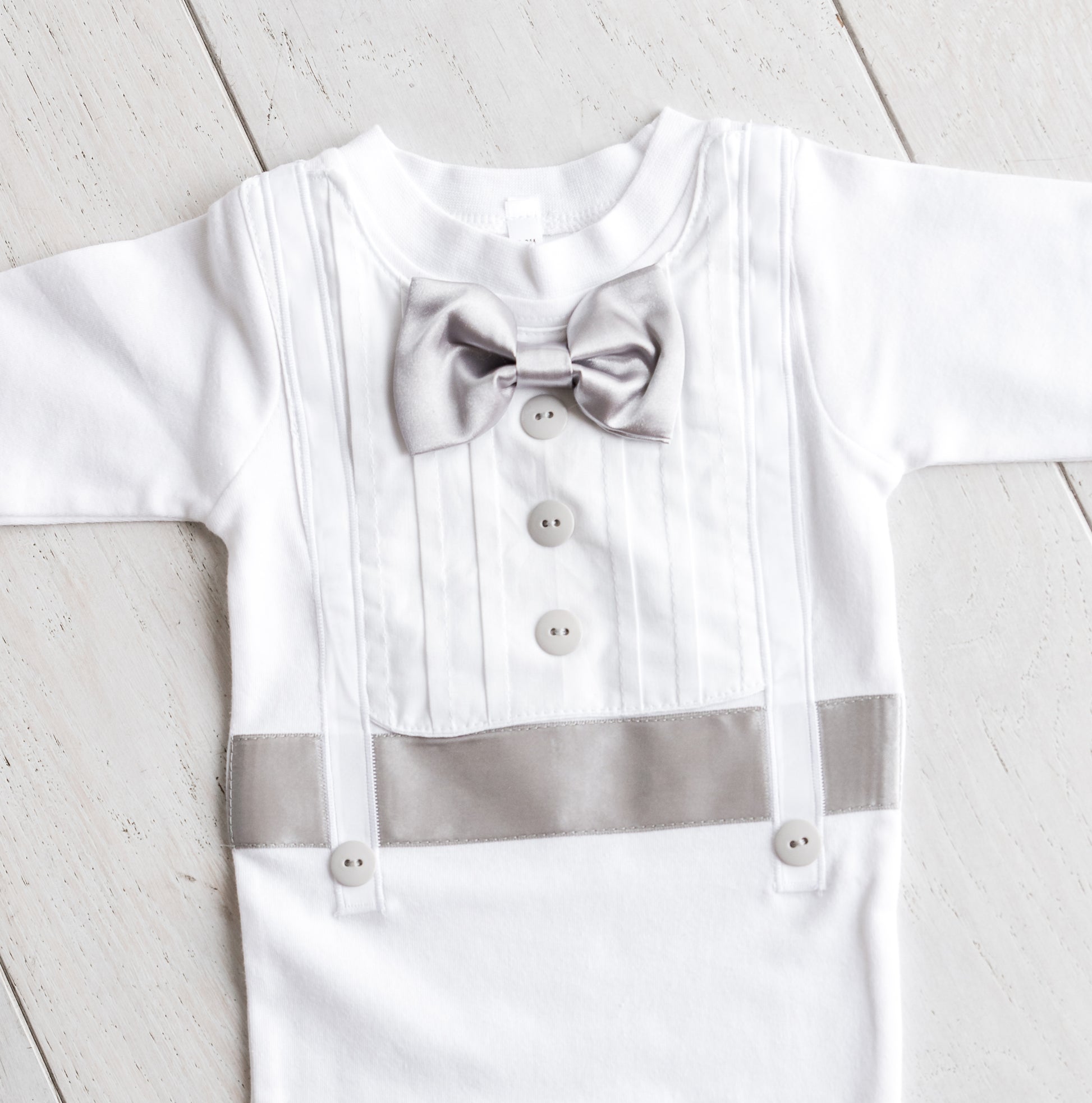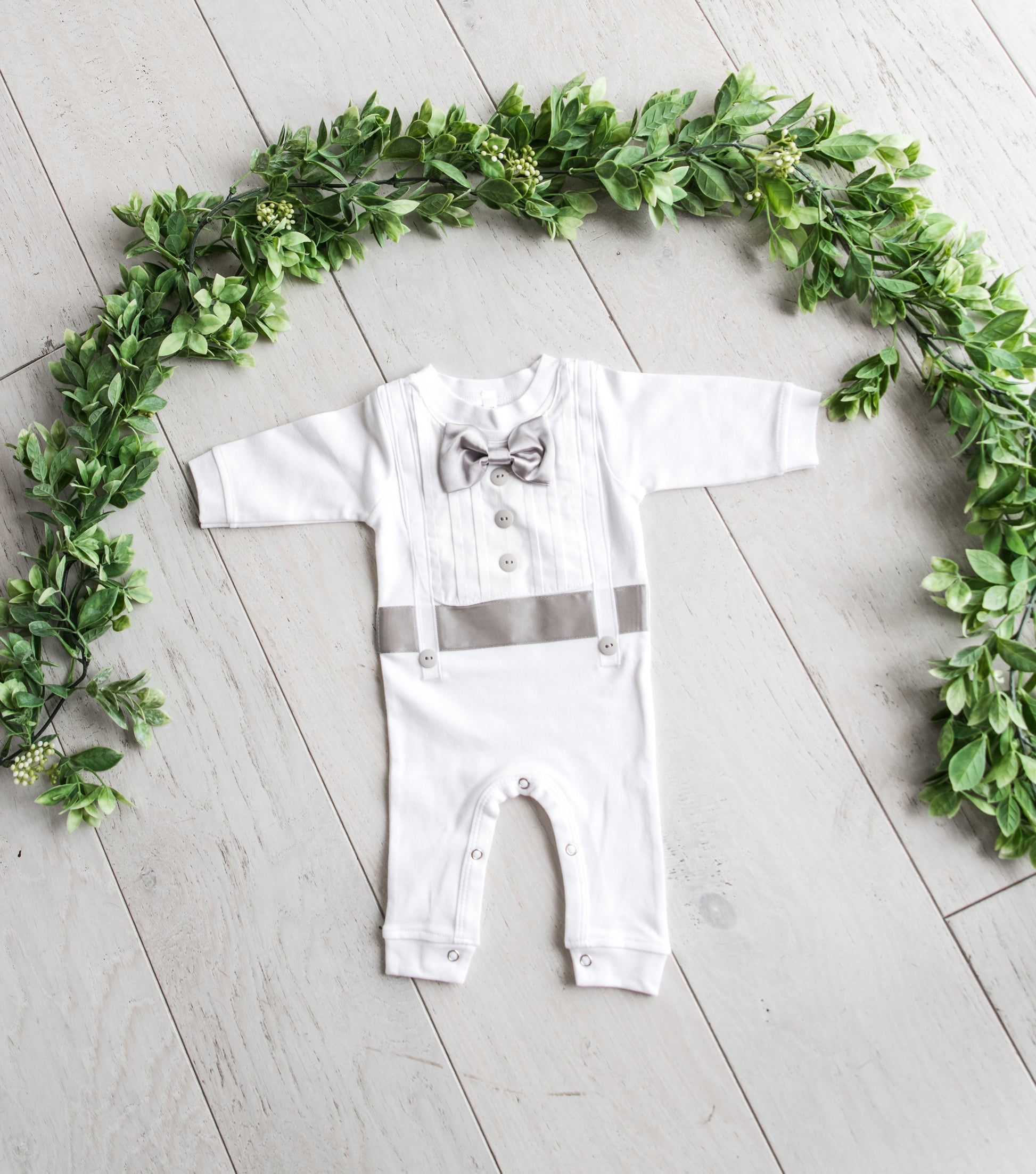 Dress your smallest gentleman in timeless elegance with our Baby Tuxedo Romper, specially designed for younger babies who need a one-piece option. Proudly handmade in the USA, this romper is crafted from premium, soft, and breathable fabrics to ensure all-day comfort while maintaining a polished and sophisticated look.